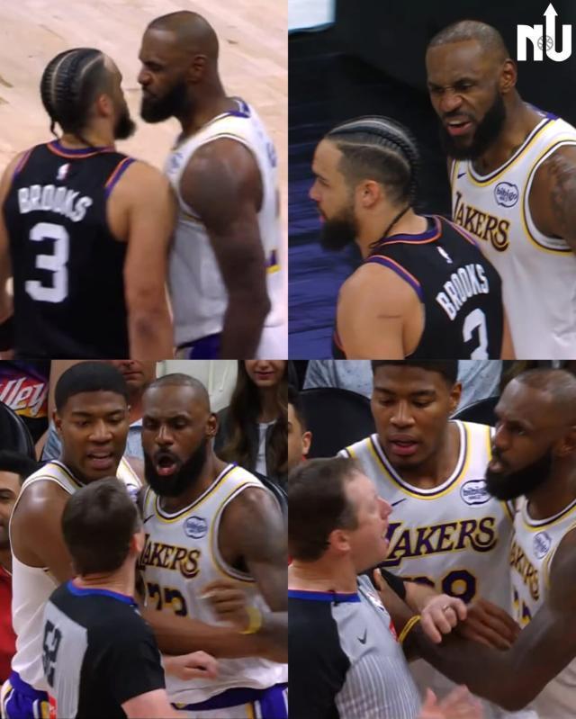 狄龙·布鲁克斯愤怒地朝裁判抱怨着,随后他从地上爬起来,在回防时和詹姆斯来了一次撞胸对峙,这一下被裁判逮个正着。最终主裁吹罚狄龙技术犯规,而他也因为领到本场比赛个人第二个技犯被驱逐出了场。